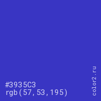 Цвет #3935C3 в цветовой модели RGB обозначается тремя октетами (57, 53, 195) в десятичном формате и #3935C3 в шестнадцатиричном (hex) формате, которые являются интенсивностью красного 57 (hex 39), интенсивность зелёного 53 (hex 35) и интенсивность синего 195 (hex C3).