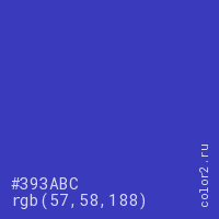 Цвет #393ABC в цветовой модели RGB обозначается тремя октетами (57, 58, 188) в десятичном формате и #393ABC в шестнадцатиричном (hex) формате, которые являются интенсивностью красного 57 (hex 39), интенсивность зелёного 58 (hex 3A) и интенсивность синего 188 (hex BC).