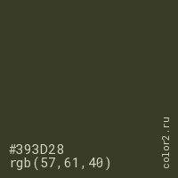 Цвет #393D28 в цветовой модели RGB обозначается тремя октетами (57, 61, 40) в десятичном формате и #393D28 в шестнадцатиричном (hex) формате, которые являются интенсивностью красного 57 (hex 39), интенсивность зелёного 61 (hex 3D) и интенсивность синего 40 (hex 28).