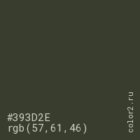 Цвет #393D2E в цветовой модели RGB обозначается тремя октетами (57, 61, 46) в десятичном формате и #393D2E в шестнадцатиричном (hex) формате, которые являются интенсивностью красного 57 (hex 39), интенсивность зелёного 61 (hex 3D) и интенсивность синего 46 (hex 2E).