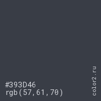 Цвет #393D46 в цветовой модели RGB обозначается тремя октетами (57, 61, 70) в десятичном формате и #393D46 в шестнадцатиричном (hex) формате, которые являются интенсивностью красного 57 (hex 39), интенсивность зелёного 61 (hex 3D) и интенсивность синего 70 (hex 46).