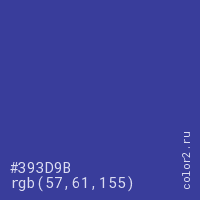Цвет #393D9B в цветовой модели RGB обозначается тремя октетами (57, 61, 155) в десятичном формате и #393D9B в шестнадцатиричном (hex) формате, которые являются интенсивностью красного 57 (hex 39), интенсивность зелёного 61 (hex 3D) и интенсивность синего 155 (hex 9B).