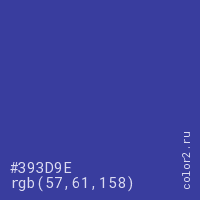 Цвет #393D9E в цветовой модели RGB обозначается тремя октетами (57, 61, 158) в десятичном формате и #393D9E в шестнадцатиричном (hex) формате, которые являются интенсивностью красного 57 (hex 39), интенсивность зелёного 61 (hex 3D) и интенсивность синего 158 (hex 9E).