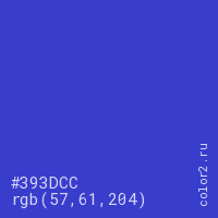 Цвет #393DCC в цветовой модели RGB обозначается тремя октетами (57, 61, 204) в десятичном формате и #393DCC в шестнадцатиричном (hex) формате, которые являются интенсивностью красного 57 (hex 39), интенсивность зелёного 61 (hex 3D) и интенсивность синего 204 (hex CC).