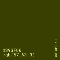 Цвет #393F00 в цветовой модели RGB обозначается тремя октетами (57, 63, 0) в десятичном формате и #393F00 в шестнадцатиричном (hex) формате, которые являются интенсивностью красного 57 (hex 39), интенсивность зелёного 63 (hex 3F) и интенсивность синего 0 (hex 00).