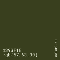 Цвет #393F1E в цветовой модели RGB обозначается тремя октетами (57, 63, 30) в десятичном формате и #393F1E в шестнадцатиричном (hex) формате, которые являются интенсивностью красного 57 (hex 39), интенсивность зелёного 63 (hex 3F) и интенсивность синего 30 (hex 1E).
