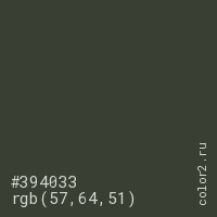 Цвет #394033 в цветовой модели RGB обозначается тремя октетами (57, 64, 51) в десятичном формате и #394033 в шестнадцатиричном (hex) формате, которые являются интенсивностью красного 57 (hex 39), интенсивность зелёного 64 (hex 40) и интенсивность синего 51 (hex 33).