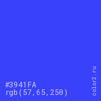 Цвет #3941FA в цветовой модели RGB обозначается тремя октетами (57, 65, 250) в десятичном формате и #3941FA в шестнадцатиричном (hex) формате, которые являются интенсивностью красного 57 (hex 39), интенсивность зелёного 65 (hex 41) и интенсивность синего 250 (hex FA).