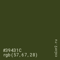Цвет #39431C в цветовой модели RGB обозначается тремя октетами (57, 67, 28) в десятичном формате и #39431C в шестнадцатиричном (hex) формате, которые являются интенсивностью красного 57 (hex 39), интенсивность зелёного 67 (hex 43) и интенсивность синего 28 (hex 1C).