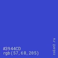 Цвет #3944CD в цветовой модели RGB обозначается тремя октетами (57, 68, 205) в десятичном формате и #3944CD в шестнадцатиричном (hex) формате, которые являются интенсивностью красного 57 (hex 39), интенсивность зелёного 68 (hex 44) и интенсивность синего 205 (hex CD).