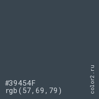 Цвет #39454F в цветовой модели RGB обозначается тремя октетами (57, 69, 79) в десятичном формате и #39454F в шестнадцатиричном (hex) формате, которые являются интенсивностью красного 57 (hex 39), интенсивность зелёного 69 (hex 45) и интенсивность синего 79 (hex 4F).