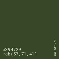 Цвет #394729 в цветовой модели RGB обозначается тремя октетами (57, 71, 41) в десятичном формате и #394729 в шестнадцатиричном (hex) формате, которые являются интенсивностью красного 57 (hex 39), интенсивность зелёного 71 (hex 47) и интенсивность синего 41 (hex 29).