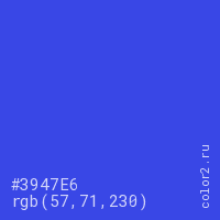 Цвет #3947E6 в цветовой модели RGB обозначается тремя октетами (57, 71, 230) в десятичном формате и #3947E6 в шестнадцатиричном (hex) формате, которые являются интенсивностью красного 57 (hex 39), интенсивность зелёного 71 (hex 47) и интенсивность синего 230 (hex E6).
