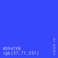 Цвет #3947FB в цветовой модели RGB обозначается тремя октетами (57, 71, 251) в десятичном формате и #3947FB в шестнадцатиричном (hex) формате, которые являются интенсивностью красного 57 (hex 39), интенсивность зелёного 71 (hex 47) и интенсивность синего 251 (hex FB).