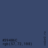 Цвет #39486C в цветовой модели RGB обозначается тремя октетами (57, 72, 108) в десятичном формате и #39486C в шестнадцатиричном (hex) формате, которые являются интенсивностью красного 57 (hex 39), интенсивность зелёного 72 (hex 48) и интенсивность синего 108 (hex 6C).