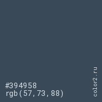 Цвет #394958 в цветовой модели RGB обозначается тремя октетами (57, 73, 88) в десятичном формате и #394958 в шестнадцатиричном (hex) формате, которые являются интенсивностью красного 57 (hex 39), интенсивность зелёного 73 (hex 49) и интенсивность синего 88 (hex 58).