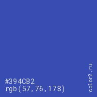 Цвет #394CB2 в цветовой модели RGB обозначается тремя октетами (57, 76, 178) в десятичном формате и #394CB2 в шестнадцатиричном (hex) формате, которые являются интенсивностью красного 57 (hex 39), интенсивность зелёного 76 (hex 4C) и интенсивность синего 178 (hex B2).