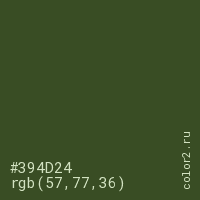Цвет #394D24 в цветовой модели RGB обозначается тремя октетами (57, 77, 36) в десятичном формате и #394D24 в шестнадцатиричном (hex) формате, которые являются интенсивностью красного 57 (hex 39), интенсивность зелёного 77 (hex 4D) и интенсивность синего 36 (hex 24).