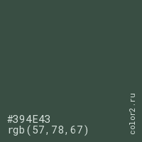 Цвет #394E43 в цветовой модели RGB обозначается тремя октетами (57, 78, 67) в десятичном формате и #394E43 в шестнадцатиричном (hex) формате, которые являются интенсивностью красного 57 (hex 39), интенсивность зелёного 78 (hex 4E) и интенсивность синего 67 (hex 43).