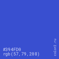 Цвет #394FD0 в цветовой модели RGB обозначается тремя октетами (57, 79, 208) в десятичном формате и #394FD0 в шестнадцатиричном (hex) формате, которые являются интенсивностью красного 57 (hex 39), интенсивность зелёного 79 (hex 4F) и интенсивность синего 208 (hex D0).