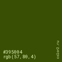 Цвет #395004 в цветовой модели RGB обозначается тремя октетами (57, 80, 4) в десятичном формате и #395004 в шестнадцатиричном (hex) формате, которые являются интенсивностью красного 57 (hex 39), интенсивность зелёного 80 (hex 50) и интенсивность синего 4 (hex 04).