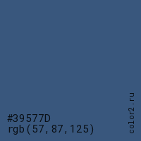 Цвет #39577D в цветовой модели RGB обозначается тремя октетами (57, 87, 125) в десятичном формате и #39577D в шестнадцатиричном (hex) формате, которые являются интенсивностью красного 57 (hex 39), интенсивность зелёного 87 (hex 57) и интенсивность синего 125 (hex 7D).