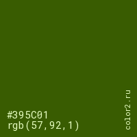 Цвет #395C01 в цветовой модели RGB обозначается тремя октетами (57, 92, 1) в десятичном формате и #395C01 в шестнадцатиричном (hex) формате, которые являются интенсивностью красного 57 (hex 39), интенсивность зелёного 92 (hex 5C) и интенсивность синего 1 (hex 01).