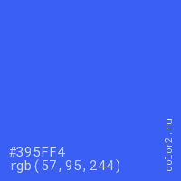 Цвет #395FF4 в цветовой модели RGB обозначается тремя октетами (57, 95, 244) в десятичном формате и #395FF4 в шестнадцатиричном (hex) формате, которые являются интенсивностью красного 57 (hex 39), интенсивность зелёного 95 (hex 5F) и интенсивность синего 244 (hex F4).