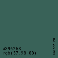 Цвет #396258 в цветовой модели RGB обозначается тремя октетами (57, 98, 88) в десятичном формате и #396258 в шестнадцатиричном (hex) формате, которые являются интенсивностью красного 57 (hex 39), интенсивность зелёного 98 (hex 62) и интенсивность синего 88 (hex 58).