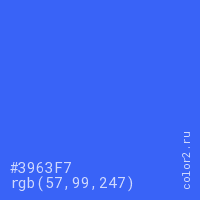 Цвет #3963F7 в цветовой модели RGB обозначается тремя октетами (57, 99, 247) в десятичном формате и #3963F7 в шестнадцатиричном (hex) формате, которые являются интенсивностью красного 57 (hex 39), интенсивность зелёного 99 (hex 63) и интенсивность синего 247 (hex F7).