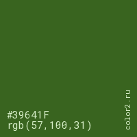 Цвет #39641F в цветовой модели RGB обозначается тремя октетами (57, 100, 31) в десятичном формате и #39641F в шестнадцатиричном (hex) формате, которые являются интенсивностью красного 57 (hex 39), интенсивность зелёного 100 (hex 64) и интенсивность синего 31 (hex 1F).