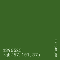 Цвет #396525 в цветовой модели RGB обозначается тремя октетами (57, 101, 37) в десятичном формате и #396525 в шестнадцатиричном (hex) формате, которые являются интенсивностью красного 57 (hex 39), интенсивность зелёного 101 (hex 65) и интенсивность синего 37 (hex 25).