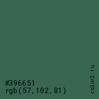 Цвет #396651 в цветовой модели RGB обозначается тремя октетами (57, 102, 81) в десятичном формате и #396651 в шестнадцатиричном (hex) формате, которые являются интенсивностью красного 57 (hex 39), интенсивность зелёного 102 (hex 66) и интенсивность синего 81 (hex 51).