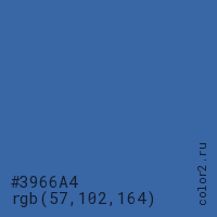 Цвет #3966A4 в цветовой модели RGB обозначается тремя октетами (57, 102, 164) в десятичном формате и #3966A4 в шестнадцатиричном (hex) формате, которые являются интенсивностью красного 57 (hex 39), интенсивность зелёного 102 (hex 66) и интенсивность синего 164 (hex A4).