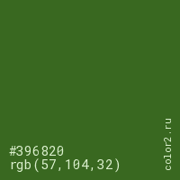 Цвет #396820 в цветовой модели RGB обозначается тремя октетами (57, 104, 32) в десятичном формате и #396820 в шестнадцатиричном (hex) формате, которые являются интенсивностью красного 57 (hex 39), интенсивность зелёного 104 (hex 68) и интенсивность синего 32 (hex 20).