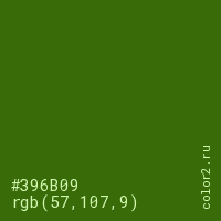 Цвет #396B09 в цветовой модели RGB обозначается тремя октетами (57, 107, 9) в десятичном формате и #396B09 в шестнадцатиричном (hex) формате, которые являются интенсивностью красного 57 (hex 39), интенсивность зелёного 107 (hex 6B) и интенсивность синего 9 (hex 09).
