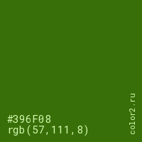 Цвет #396F08 в цветовой модели RGB обозначается тремя октетами (57, 111, 8) в десятичном формате и #396F08 в шестнадцатиричном (hex) формате, которые являются интенсивностью красного 57 (hex 39), интенсивность зелёного 111 (hex 6F) и интенсивность синего 8 (hex 08).