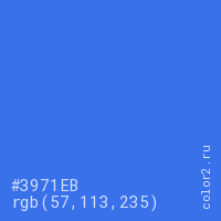 Цвет #3971EB в цветовой модели RGB обозначается тремя октетами (57, 113, 235) в десятичном формате и #3971EB в шестнадцатиричном (hex) формате, которые являются интенсивностью красного 57 (hex 39), интенсивность зелёного 113 (hex 71) и интенсивность синего 235 (hex EB).