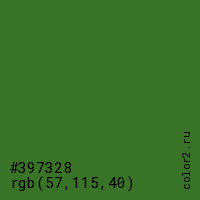 Цвет #397328 в цветовой модели RGB обозначается тремя октетами (57, 115, 40) в десятичном формате и #397328 в шестнадцатиричном (hex) формате, которые являются интенсивностью красного 57 (hex 39), интенсивность зелёного 115 (hex 73) и интенсивность синего 40 (hex 28).