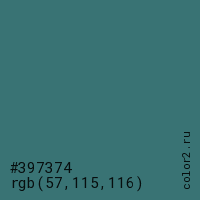 Цвет #397374 в цветовой модели RGB обозначается тремя октетами (57, 115, 116) в десятичном формате и #397374 в шестнадцатиричном (hex) формате, которые являются интенсивностью красного 57 (hex 39), интенсивность зелёного 115 (hex 73) и интенсивность синего 116 (hex 74).