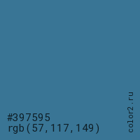 Цвет #397595 в цветовой модели RGB обозначается тремя октетами (57, 117, 149) в десятичном формате и #397595 в шестнадцатиричном (hex) формате, которые являются интенсивностью красного 57 (hex 39), интенсивность зелёного 117 (hex 75) и интенсивность синего 149 (hex 95).