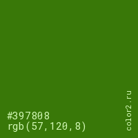 Цвет #397808 в цветовой модели RGB обозначается тремя октетами (57, 120, 8) в десятичном формате и #397808 в шестнадцатиричном (hex) формате, которые являются интенсивностью красного 57 (hex 39), интенсивность зелёного 120 (hex 78) и интенсивность синего 8 (hex 08).