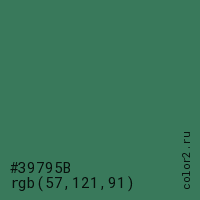 Цвет #39795B в цветовой модели RGB обозначается тремя октетами (57, 121, 91) в десятичном формате и #39795B в шестнадцатиричном (hex) формате, которые являются интенсивностью красного 57 (hex 39), интенсивность зелёного 121 (hex 79) и интенсивность синего 91 (hex 5B).