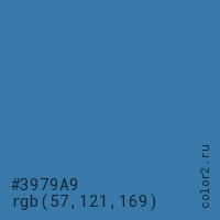 Цвет #3979A9 в цветовой модели RGB обозначается тремя октетами (57, 121, 169) в десятичном формате и #3979A9 в шестнадцатиричном (hex) формате, которые являются интенсивностью красного 57 (hex 39), интенсивность зелёного 121 (hex 79) и интенсивность синего 169 (hex A9).