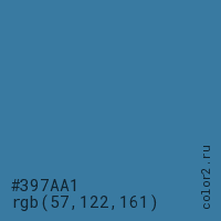 Цвет #397AA1 в цветовой модели RGB обозначается тремя октетами (57, 122, 161) в десятичном формате и #397AA1 в шестнадцатиричном (hex) формате, которые являются интенсивностью красного 57 (hex 39), интенсивность зелёного 122 (hex 7A) и интенсивность синего 161 (hex A1).