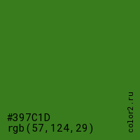 Цвет #397C1D в цветовой модели RGB обозначается тремя октетами (57, 124, 29) в десятичном формате и #397C1D в шестнадцатиричном (hex) формате, которые являются интенсивностью красного 57 (hex 39), интенсивность зелёного 124 (hex 7C) и интенсивность синего 29 (hex 1D).