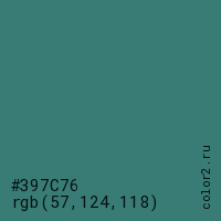 Цвет #397C76 в цветовой модели RGB обозначается тремя октетами (57, 124, 118) в десятичном формате и #397C76 в шестнадцатиричном (hex) формате, которые являются интенсивностью красного 57 (hex 39), интенсивность зелёного 124 (hex 7C) и интенсивность синего 118 (hex 76).