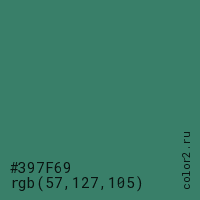 Цвет #397F69 в цветовой модели RGB обозначается тремя октетами (57, 127, 105) в десятичном формате и #397F69 в шестнадцатиричном (hex) формате, которые являются интенсивностью красного 57 (hex 39), интенсивность зелёного 127 (hex 7F) и интенсивность синего 105 (hex 69).