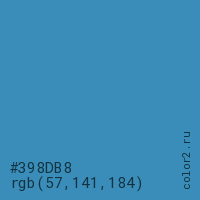 Цвет #398DB8 в цветовой модели RGB обозначается тремя октетами (57, 141, 184) в десятичном формате и #398DB8 в шестнадцатиричном (hex) формате, которые являются интенсивностью красного 57 (hex 39), интенсивность зелёного 141 (hex 8D) и интенсивность синего 184 (hex B8).