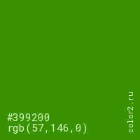 Цвет #399200 в цветовой модели RGB обозначается тремя октетами (57, 146, 0) в десятичном формате и #399200 в шестнадцатиричном (hex) формате, которые являются интенсивностью красного 57 (hex 39), интенсивность зелёного 146 (hex 92) и интенсивность синего 0 (hex 00).